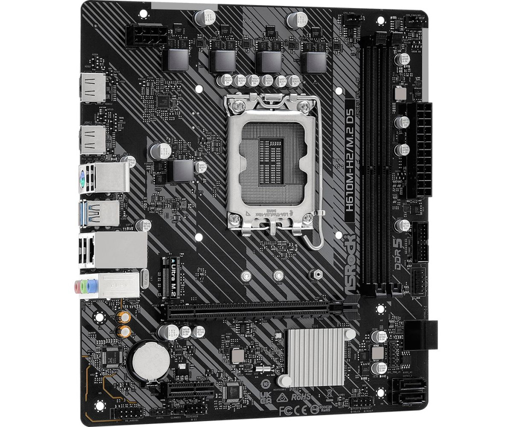 LGA1700, Intel H610, 2xDDR5, Max:5600MHz, Max:96GB, 1xPCIE16, 1xPCIE1, 4xSATA3, 4xUSB, 2xUSB3.2, HDMI, PS2:1 db, 7.1, Gigabit, 1xUltra M.2, Micro-ATX