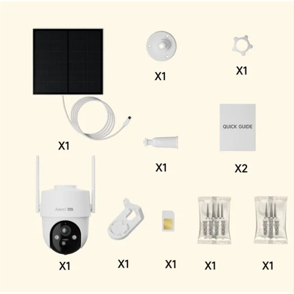 Kamera *1 Konzol *1 Csavarcsomag *1 Tápkábel *1 Gyors útmutató *1 Napelem *1 Sim kártya*1