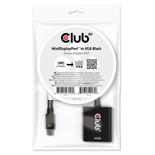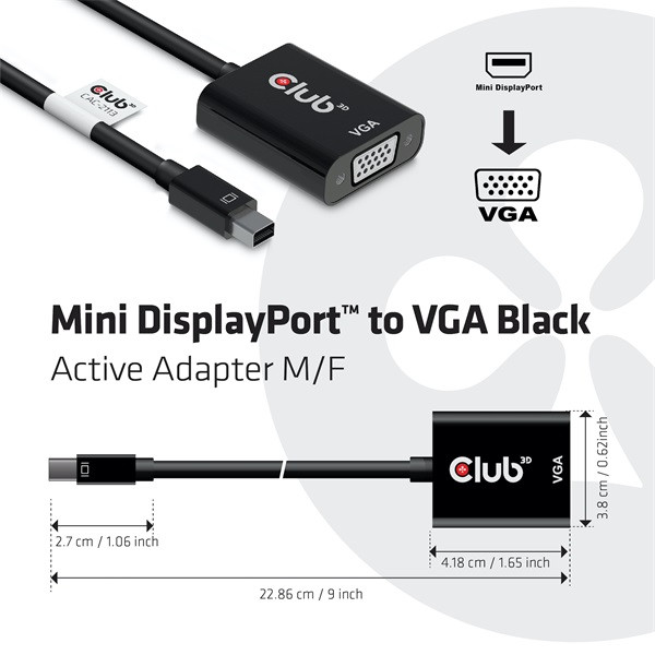 Club 3D Átalakító - CAC-2113 (Mini DisplayPor 1.1a to VGA, fekete, aktív, 1920x1200@60Hz, kompatibilis AMD/Nvidia/Intel)