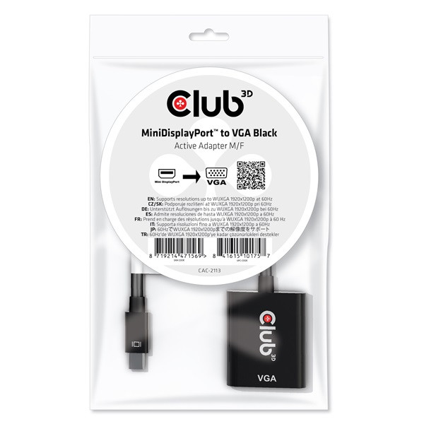 A Club 3D CAC-2113 aktív MiniDisplayPort™ - VGA jelátalakító. Lehetővé teszi, hogy analóg VGA televíziókat, monitorokat vagy projektorokat csatlakoztasson asztali gépéhez vagy laptopjához MiniDisplayPort™ kimenettel. Az adapter egyszerű plug-and-play funkciót kínál, nincs szükség illesztőprogram telepítésére, és a MiniDisplayPort™ kimenet által kap áramot.