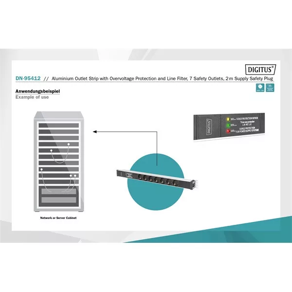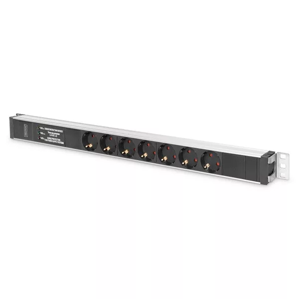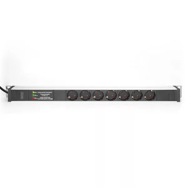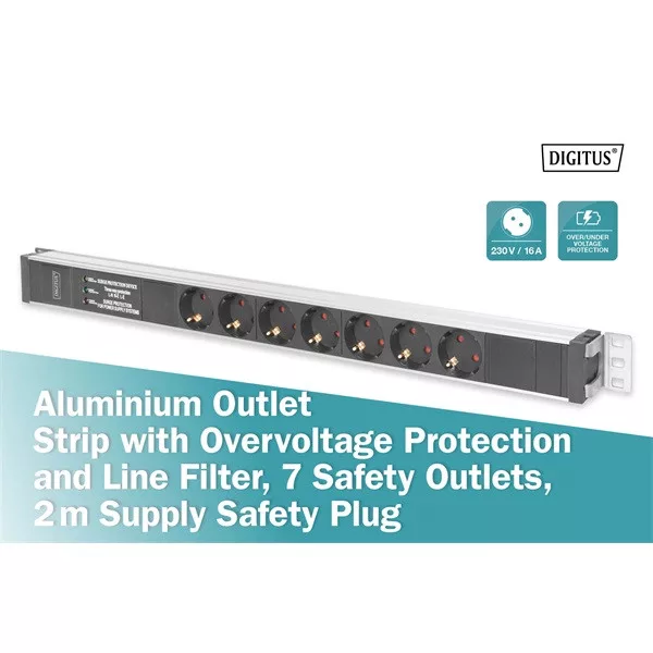 DIGITUS Aluminium elosztó túláramvédelem és vonalszűrővel, 7 biztonsági aljzat, 2 m-es csatlakozókábel