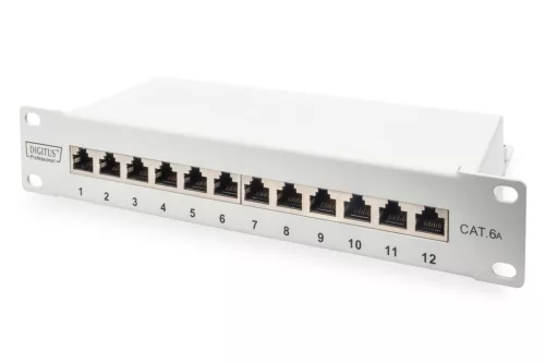 Keret kapacitása:1U, Portok száma:12db, Szerelt csatlakozók:RJ45, CAT6a, Grey