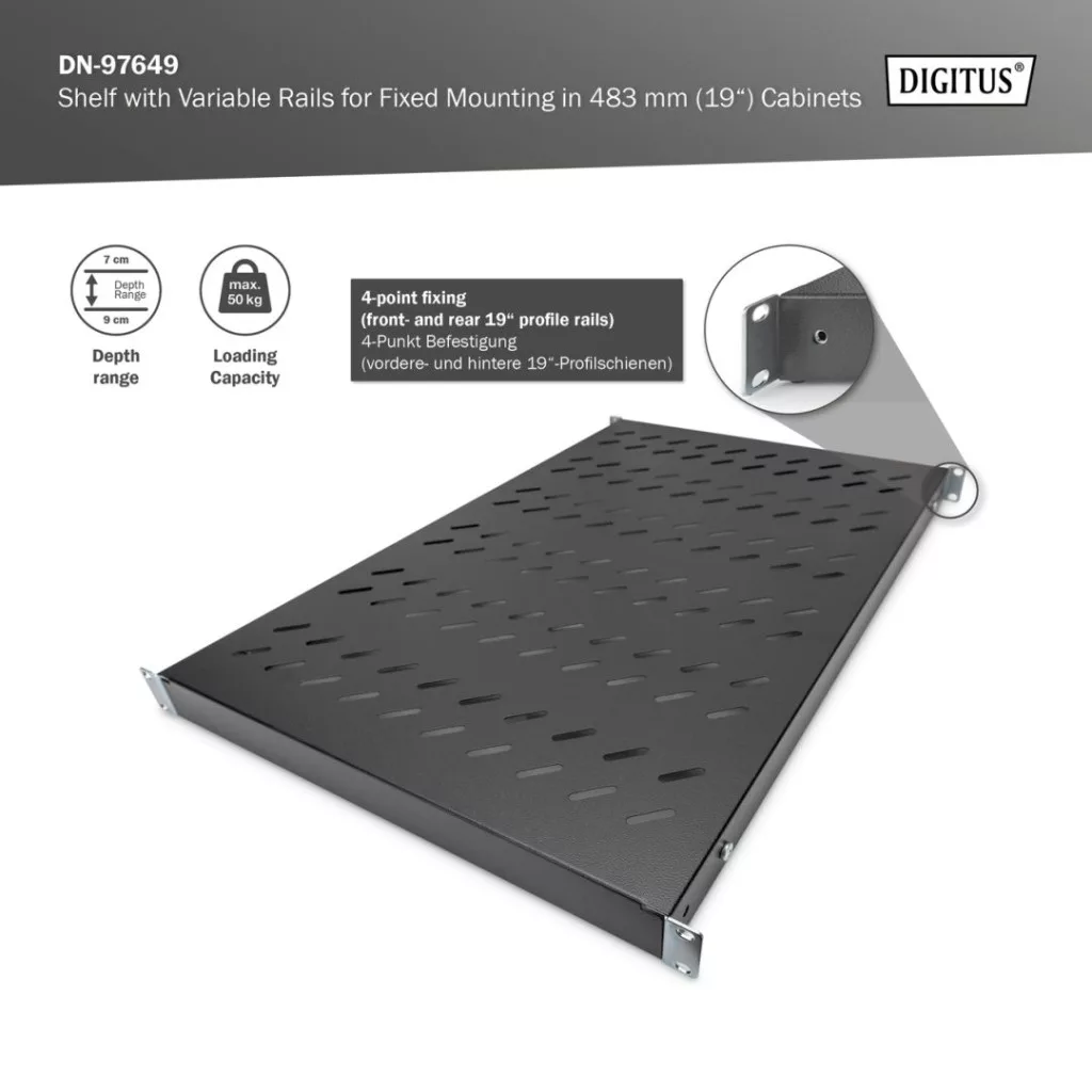 Digitus 1U fixed shelf for 1000mm depth racks 44x482x700mm adjust. 700-900mm depth Black