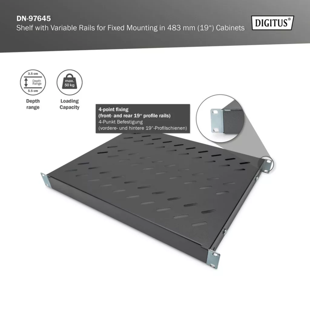 Digitus 1U fixed shelf for 600mm depth racks 44x482x350mm adjust. 350-550mm Depth Black