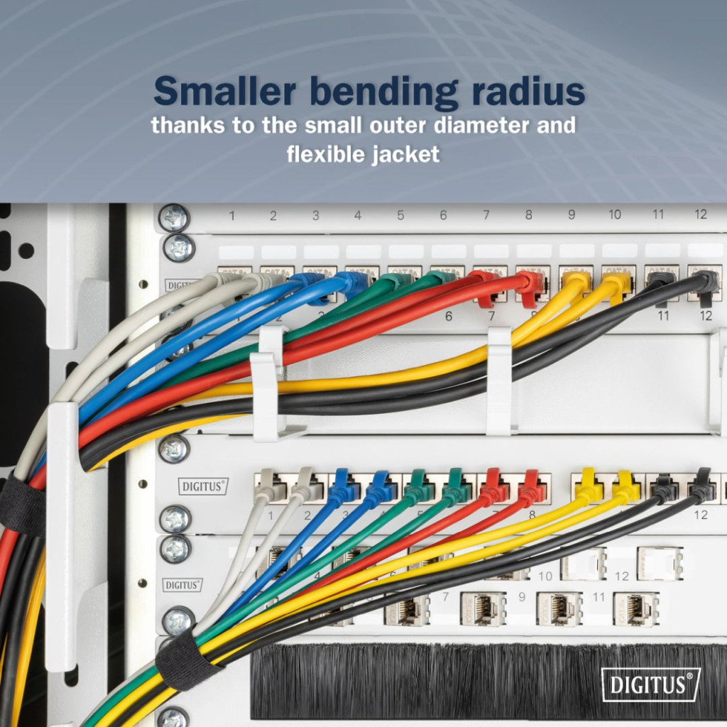 A DIGITUS® Slim patch kábeleket kis külső átmérőjük és rugalmas köpenyük jellemzi. A vékony kialakítás sokoldalú felhasználást tesz lehetővé a hálózatban. A DIGITUS® Slim patchkábelek emellett az ISO/IEC 11801 és a DIN EN 50173 CAT 6A szabványoknak megfelelően készülnek. Garantálják, hogy a kábelszerelés megfelel az ISO és EN csatornaspecifikációnak, és kiváló teljesítményt nyújtanak a DIGITUS® CAT 6A kábelezésben. A teljesítményt 500 MHz-ig tesztelték, beleértve az olyan jellemzőket is, mint a közeli keresztbeszólás ("NEXT"). A DIGITUS® patch kábeleket kifejezetten úgy fejlesztették ki, hogy megfeleljenek a különböző alkalmazási területek összes követelményének. Mindegyik kábelt húzáscsökkentővel ellátott, öntött gyűrődésgátló hüvelynel látták el. Ezenkívül a hüvelyben van egy reteszelőkar-védelem, amely megakadályozza, hogy a kábel elgörbüljön, és a reteszelőkar letörjön a dugóról.