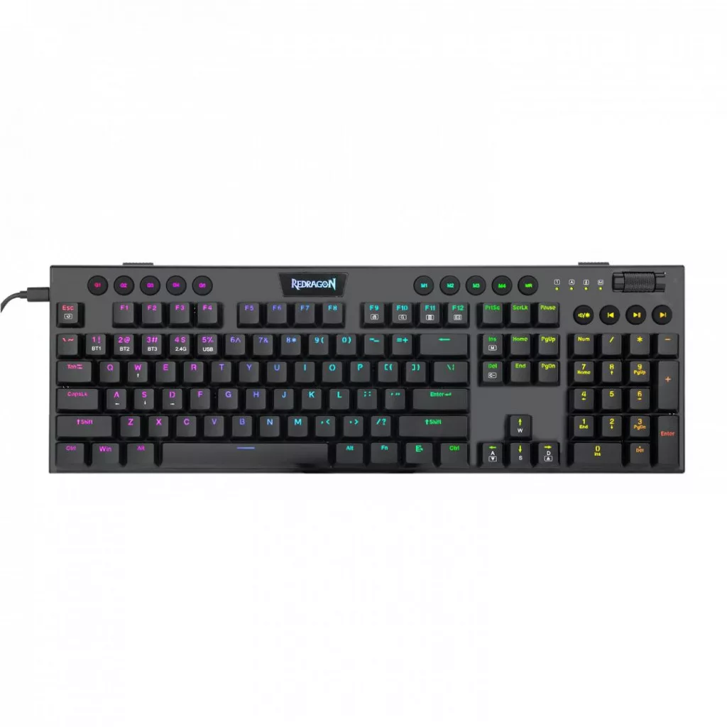 3 módú csatlakozás: Jön a Redragon innovatív első generációs 3 módú csatlakozási technológiája, USB-C vezetékes, BT 3.0/5.0 és 2.4 GHz vezeték nélküli módok, amelyek minden területen a következő szintre emelték a használati élményt.