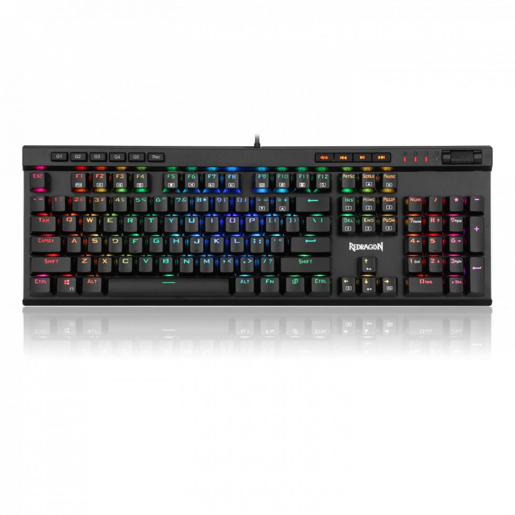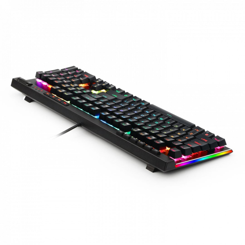 5 db makró billentyű – Az 5 darab programozható billentyű (G1 - G5) funkciói egyszerűen, külsődriver nélkül változtathatóak a szükségednek megfelelőre. A doboz nem tartalmaz CD-n mellékeltszoftvert.Dedikált multimédia billentyűk – Egy gombnyomással megállíthatód, elindíthatod vagy léptethetsz azenéden, akár játék közben is. A hangerő és háttérvilágítás fényereje ugyancsak egyszerűen, abillentyűzeten jobboldalon felül elhelyezett kerékkel szabályozható.N-Key Rollover – 104 db konfliktusmentes billentyű lehetővé teszi, hogy egyszerre használj akadásnélkül több gombot is. Az OUTEMU kék kapcsolók remek játékélményt biztosítanak a gyorsreagálásának és a kellemes klikkelő hangjának köszönhetően.RGB háttérvilágítás- 18 háttérvilágítás mód közül válaszhatod ki a helyzetnek megfelelőt. Az FN és azUp vagy Down billentyűk egyidejű lenyomásával pillanatokon belül megváltoztathatod a megvilágításfényerejét. A háttérvilágítás mellett a billentyűzet oldalán körbefutó megvilágítás is változtatható 5féle mód közül. Minden billentyű megvilágítása egyedileg beállítható külön szoftver telepítése nélkül.Tartósság – 50 millió leütésig tesztelt dizájn. A billentyűk kis ellenállással és rövid leütési úttal bírnak.A speciális, kettős fröccsöntéssel készült billentyűsapkák miatt a feliratok sosem fognak megkopni.Csepp- és porálló kialakítású.Jellegzetességek:5 programozható makró billentyűRGB oldalvonal világításA WIN billentyű játék közben kikapcsolható12 kettős felhasználású FN és multimédia billentyűkDedikált média-, hangerő- és fényerőszabályzó gombokA teljes, 104 gombos billentyűzet összes tagja konfliktusmentesTeljes numpad