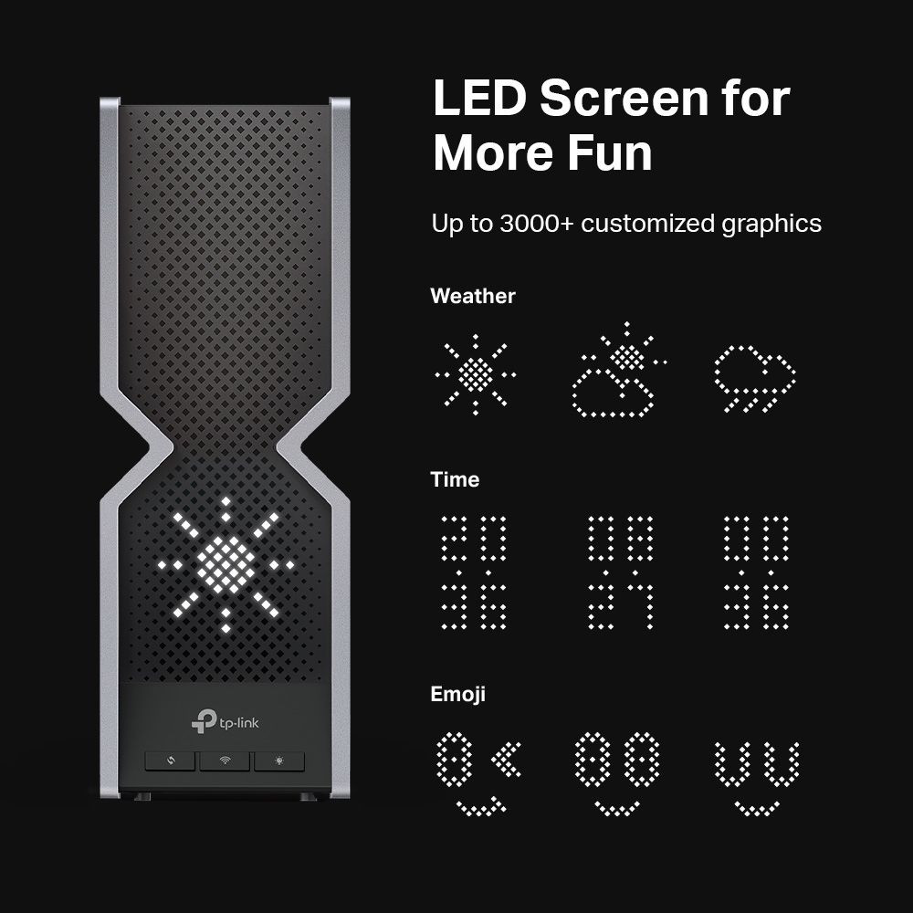 • A WiFi routerek újradefiniálása: Erőteljes WiFi 7 teljesítménnyel, villámgyors vezetékes kapcsolatokkal, vadonatúj dizájnnal és LED-képernyővel.