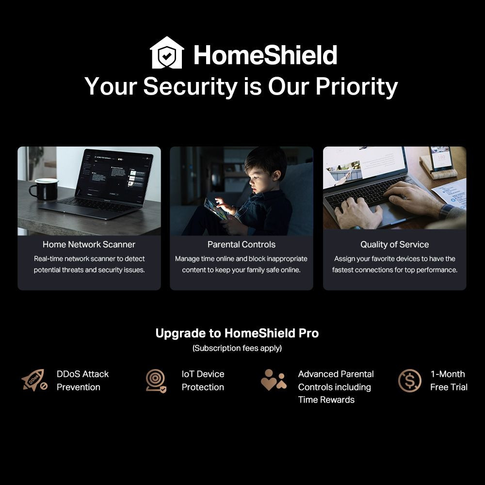• TP-Link HomeShield: Továbbfejlesztett biztonság véd a legújabb kiberfenyegetésekkel szemben.