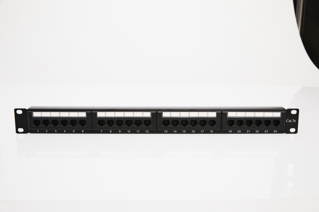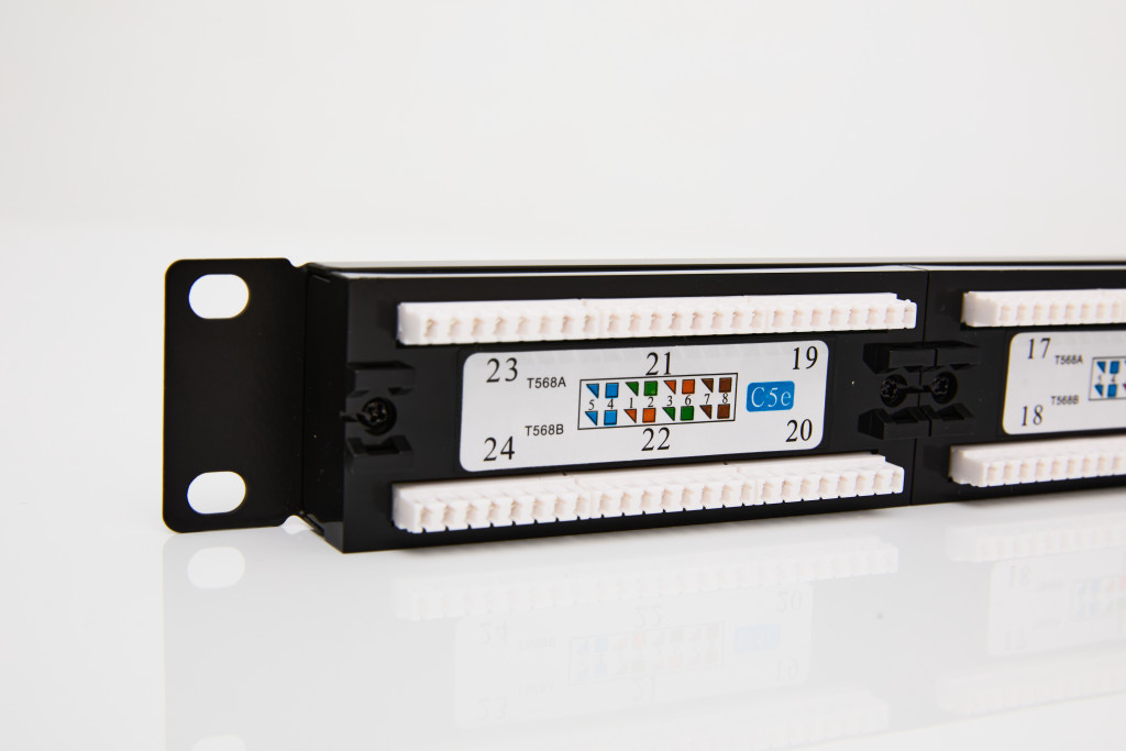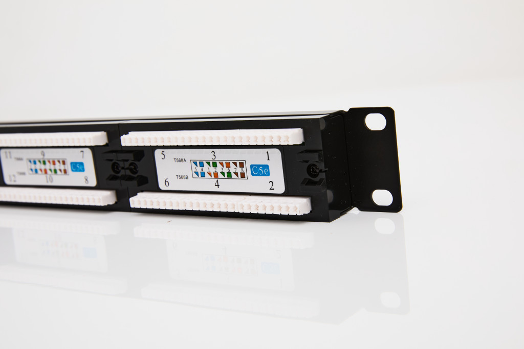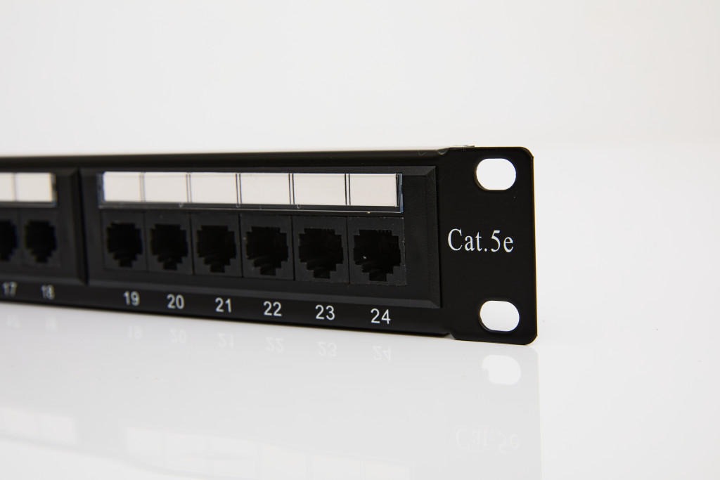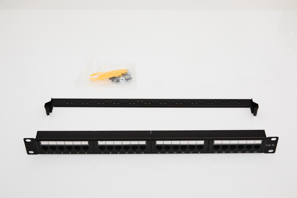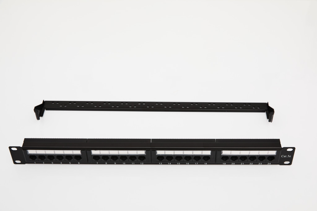 UTP Cat5e patch panel, 24 portos, levehető tehetmentesítővel