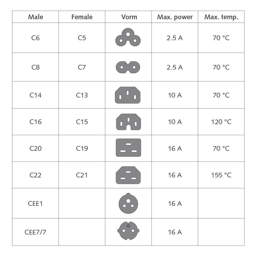 ACT sokféle tápkábelt kínál: CEE 7/7, Euro, UK, USA, olasz, dán, svájci és indiai/dél-afrikai kábelek. Az ACT a következő csatlakozókkal látja el a tápkábeleket: CEE 7/7, IEC60320 C5, C7, C13, C14, C19, C20 és IEC60309 CEE1. Az ACT különböző típusú tápkábeleket és tápkábeleket kínál a következő színekben: fekete, fehér, piros, kék, zöld és sárga.