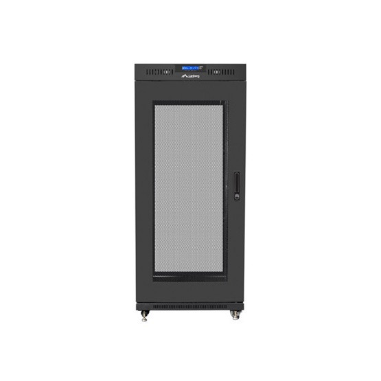 19" szabadon álló rack szekrény 27U/600X600 perforált ajtó, lapraszerelt, LCD kijelző, fekete V2
